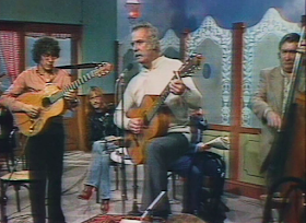 (Renaud assis derrière Brassens sur un plateau de télévision en 1978)